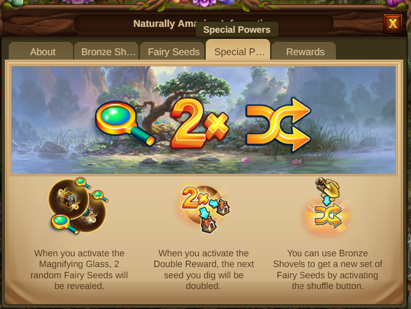 Questo evento è di tipo "shuffle", con un tabellone con 16 premi nascosti. Ogni Seme delle Fate costa 25 Vanghe di Bronzo per essere scoperto, questo vuol dire che con 400 Vanghe possiamo scoprire l'intero tabellone, ed ottenere sicuramente il premio giornaliero!